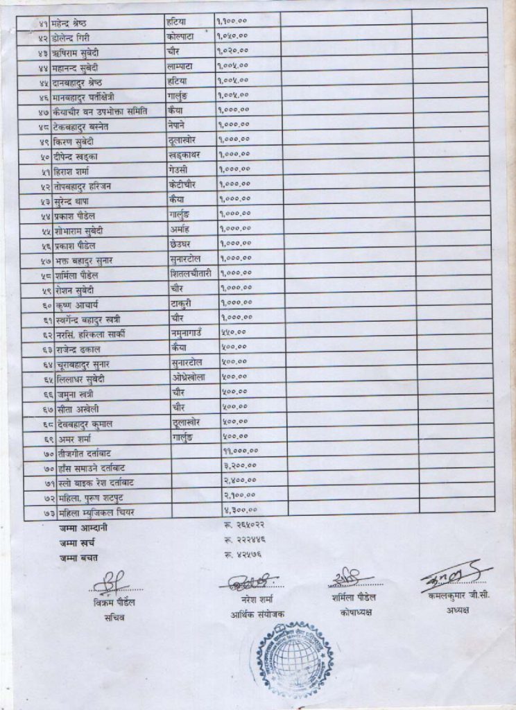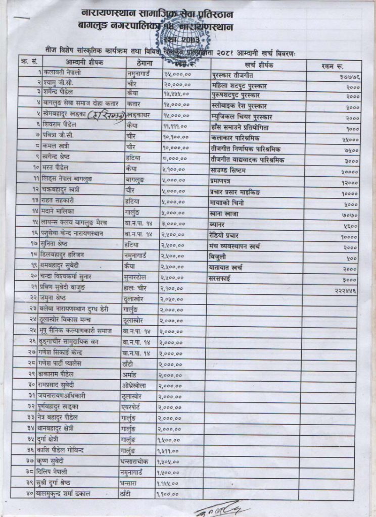 कार्यक्रम को आर्थिक संयोजक नरेश्रर शर्मा,अध्यक्ष कमल कुमार जिसि , सचिव बिक्रम पौडेल, कोषाध्यक्ष शर्मिला सुवेदी पौडेल ले तिज कार्यक्रम सकिए लगतै समीक्षा बैठक राखि आम्दानी र खर्च सार्वजनिक गरेका थिए ।