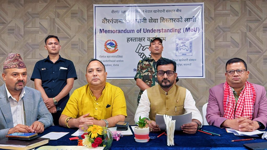 वीरगञ्ज (पर्सा), १ साउन : खानेपानी मन्त्रालय अन्तरगतको नेपाल खानेपानी संस्थान र वीरगञ्ज महानगरपालिकाबीच वीरगञ्जमा खानेपानी सेवा विस्तारका लागि एक महत्वपूर्ण समझदारीपत्रमा हस्ताक्षर भएको छ ।