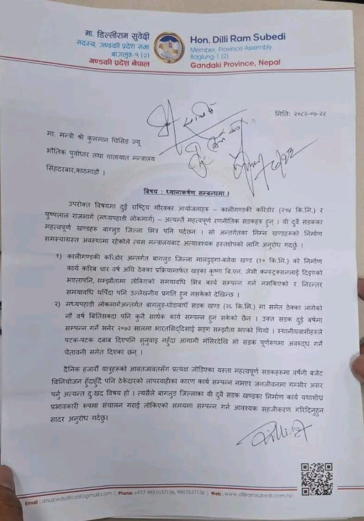 कार्तिक २४ राष्ट्रिय गौरव को आयोजना कालीगण्डकी करिडोर अन्तर्गत बागलुङ जिल्ला मालढुङ्गा-बलेवा खण्ड १० कि.मि को निर्माण कार्य करिब चार वर्ष अघि ठेक्का प्रक्रिया मार्फत खड्का कृष्ण बि.एन. जेभी कन्स्ट्रक्सनले पाएता पनि सम्झौता मा तोकिएको समयावधि भित्र कार्य सम्पन्न गर्न नसकिएको र पटक पटक समयावधि थपिँदा पनि उक्त सडक मा उल्लेखनिय प्रगति हुन नसकिएको र मध्यपहाडी लोकमार्गको बागलुङ घोडाबाधेँ सडक खण्ड २६ कि.मि को निर्माण कार्य पनि नै बर्ष बितिसक्दा पनि सम्पन्न हुन सकेको छैन । उक्त सडक दुई वर्षमा सम्पन्न गर्ने भनेर २०७३ सालमा भारतसिददिसाई संग सम्झौता भएको थियो । उक्त सडक को बिषयमा स्थानीयवासिहरुले पटक-पटक दबाब दिएपनि सुनुवाइ नहुँदा आगामी मंसिर देखि देखि सो सडक पुर्णरुपमा अवरुद्ध गर्ने चेतावनी समेत दिएका छन । दैनिक हजारौं यात्रुहरुको आवतजावत संग प्रत्यक्ष जोडिएको उक्त महत्त्वपुर्ण सडकहरुमा बर्षेनि बजेट विनियोजन हुदाहुँदै पनि ठेकदारको लापरबाहीका कारण कार्य सम्पन्न नभएको जनजिवनमा गम्भीर असर परेको दुवै सडक खण्ड का निर्माण कार्य यथाशीघ्र प्रभावकारी रुपमा संचालन गराई तोकिएको समयमा सम्पन्न गर्न आवश्यक सहजिकरण गरिदिनका लागि भौतिक पुर्वाधार तथा यातायात मन्त्री माननीय कुलमान घिसिङ को कार्यकक्षमा मा ध्यानाकर्षण पत्र बोकेर गण्डकी प्रदेश सभा सदस्य माननीय डिल्लीराम सुवेदी पुगे मन्त्रालय ।